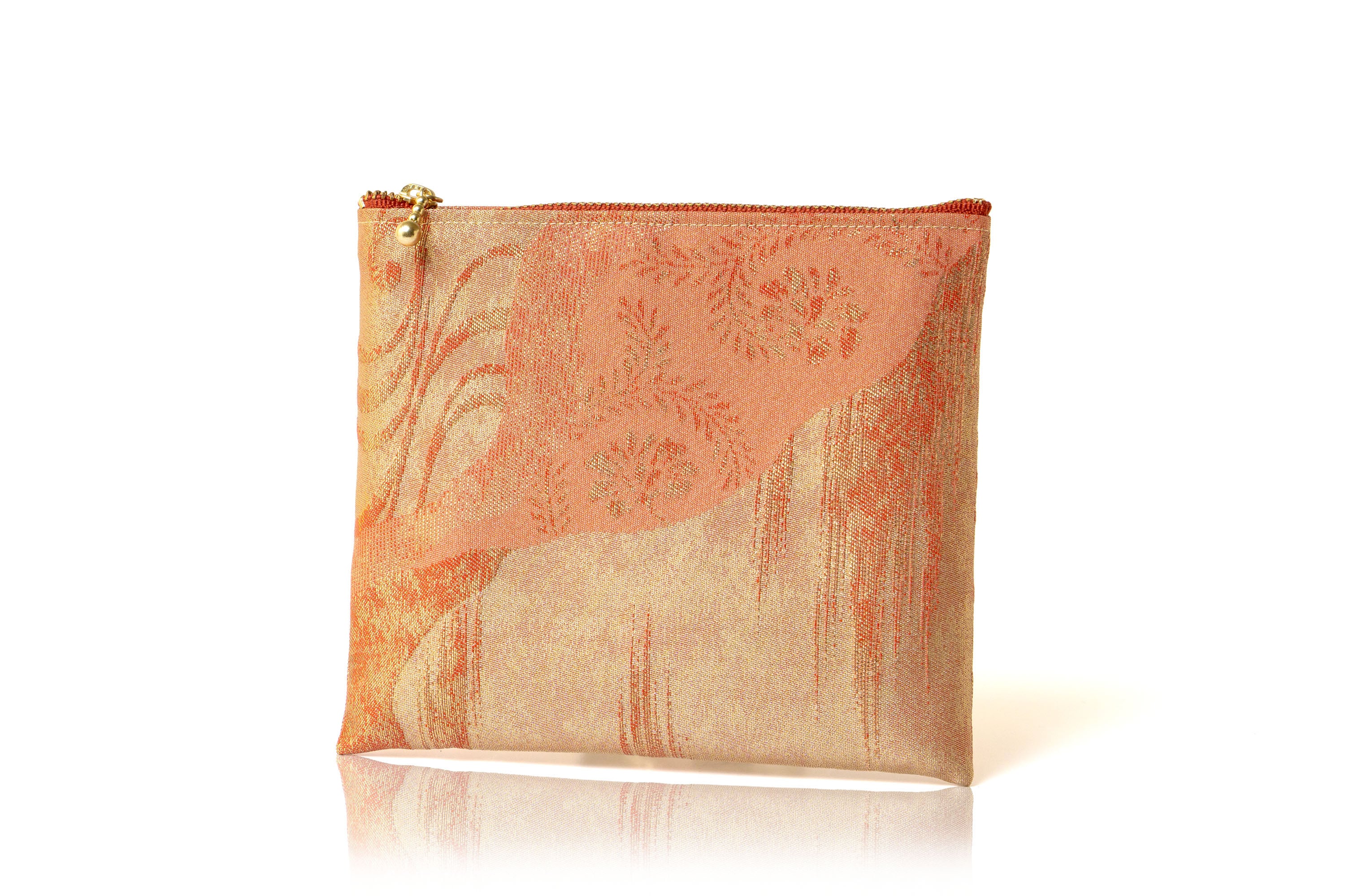 ⚫️澤屋の「らてん金錦」袋帯を使用した美しいポーチです。経絣糸に金糸を捻り合わせ、オレンジ漆箔で織り上げた『道長更紗』紋様の帯地で仕上げられております。