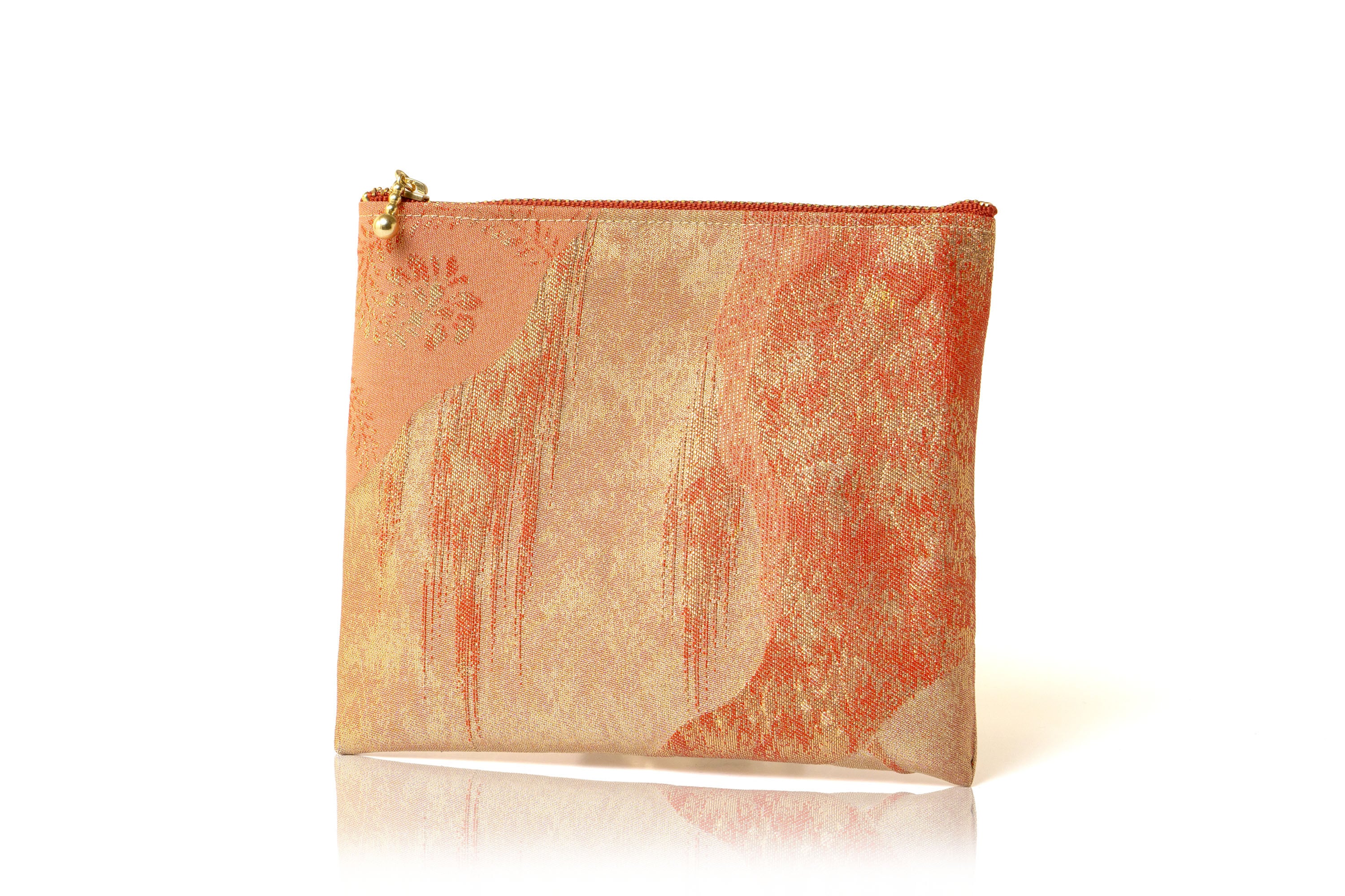 ⚫️澤屋の「らてん金錦」袋帯を使用した美しいポーチです。経絣糸に金糸を捻り合わせ、オレンジ漆箔で織り上げた『道長更紗』紋様の帯地で仕上げられております。
