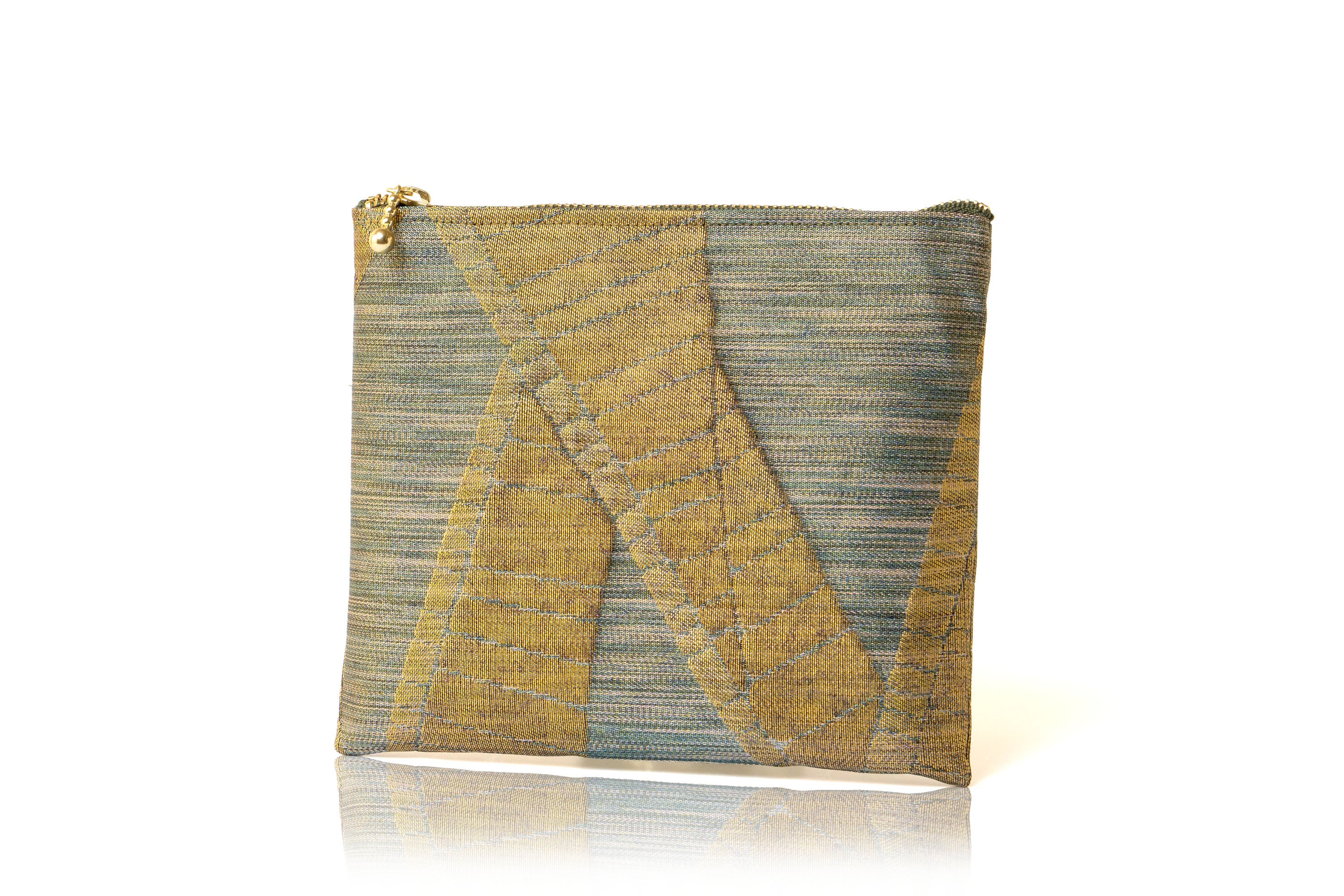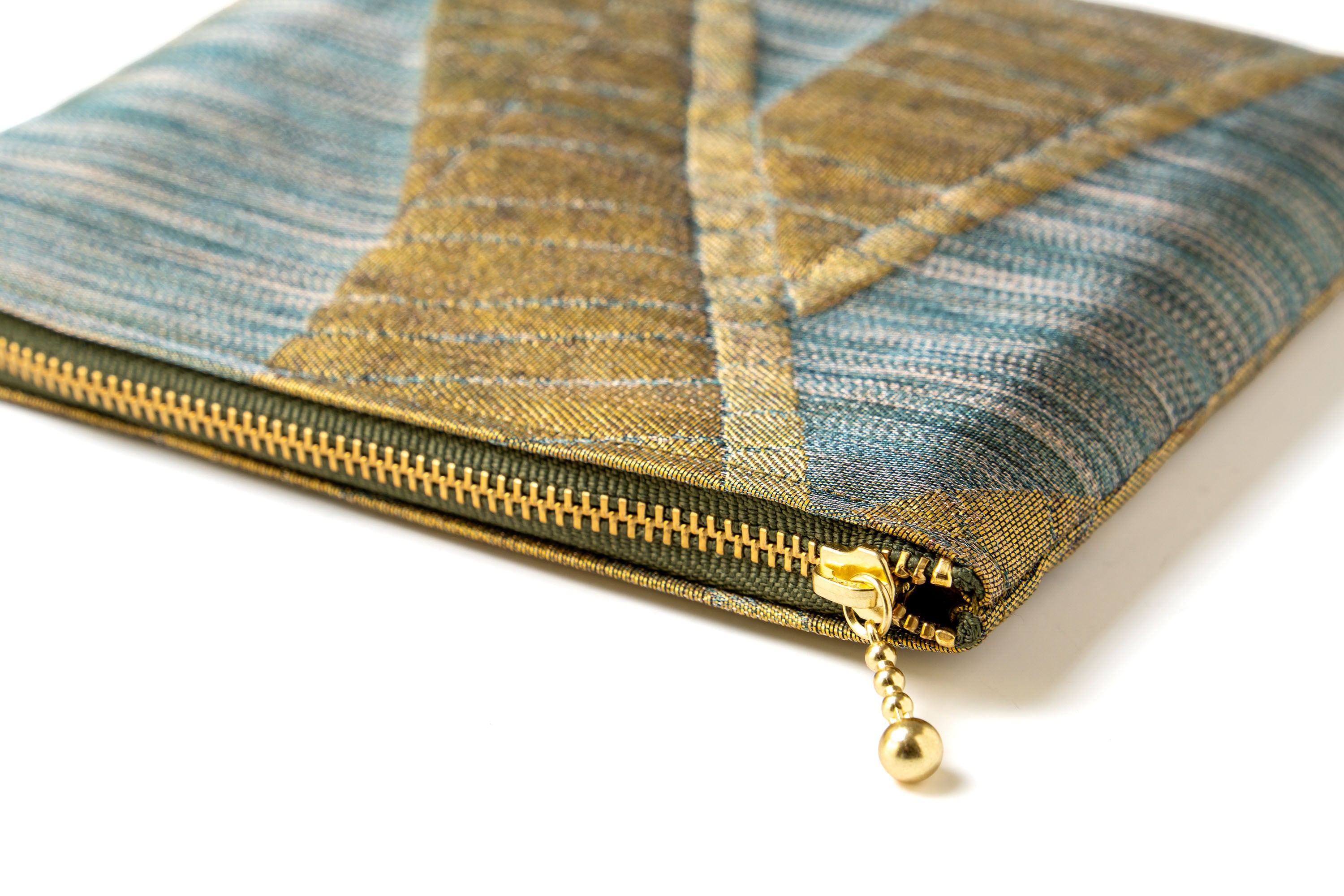 ⚫️澤屋の「らてん金錦」袋帯を使用した美しいポーチです。経絣糸に金糸を捻り合わせ、青貝箔で織り上げた『シルクロード』紋様の帯地で仕上げられております。