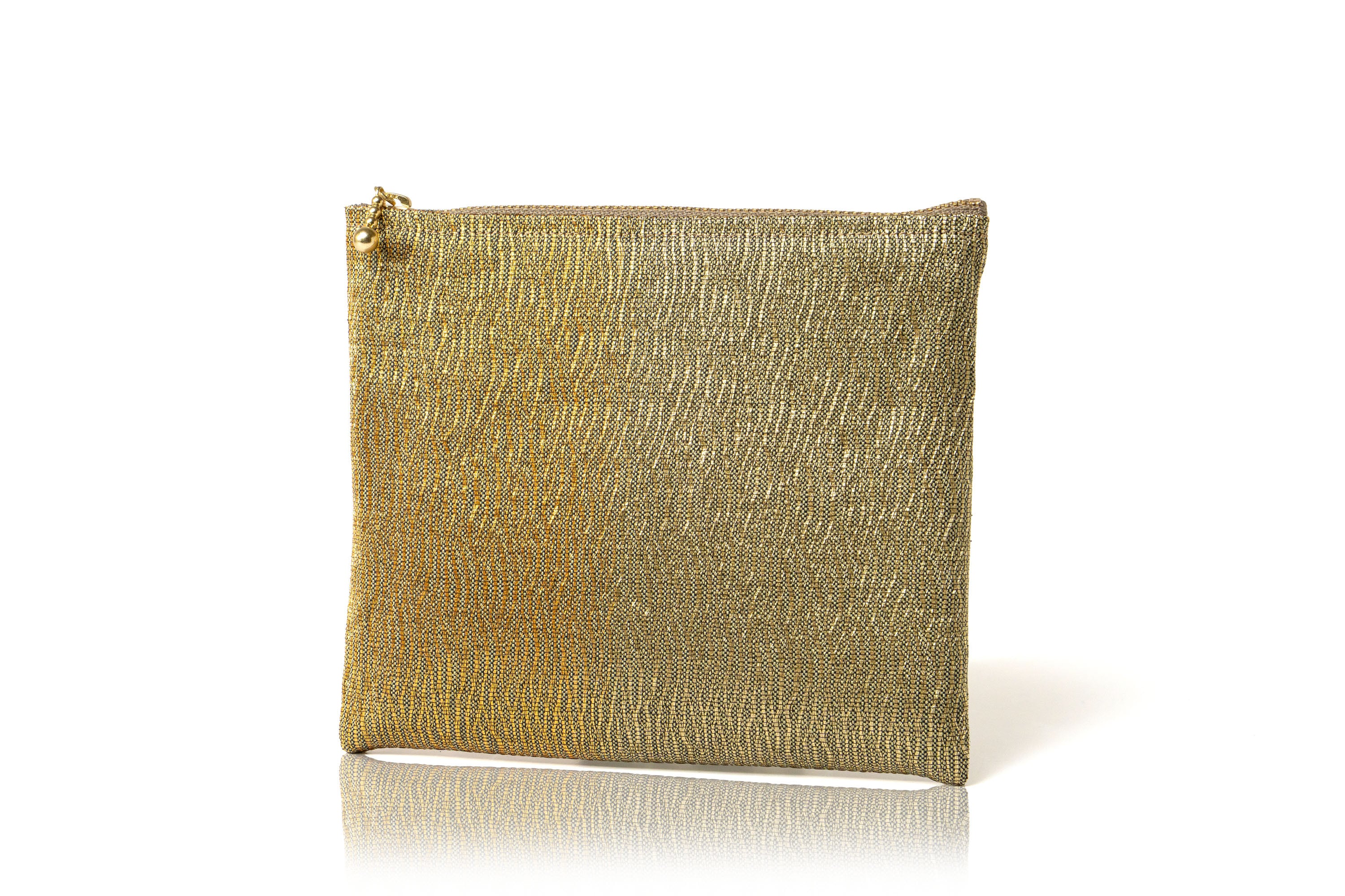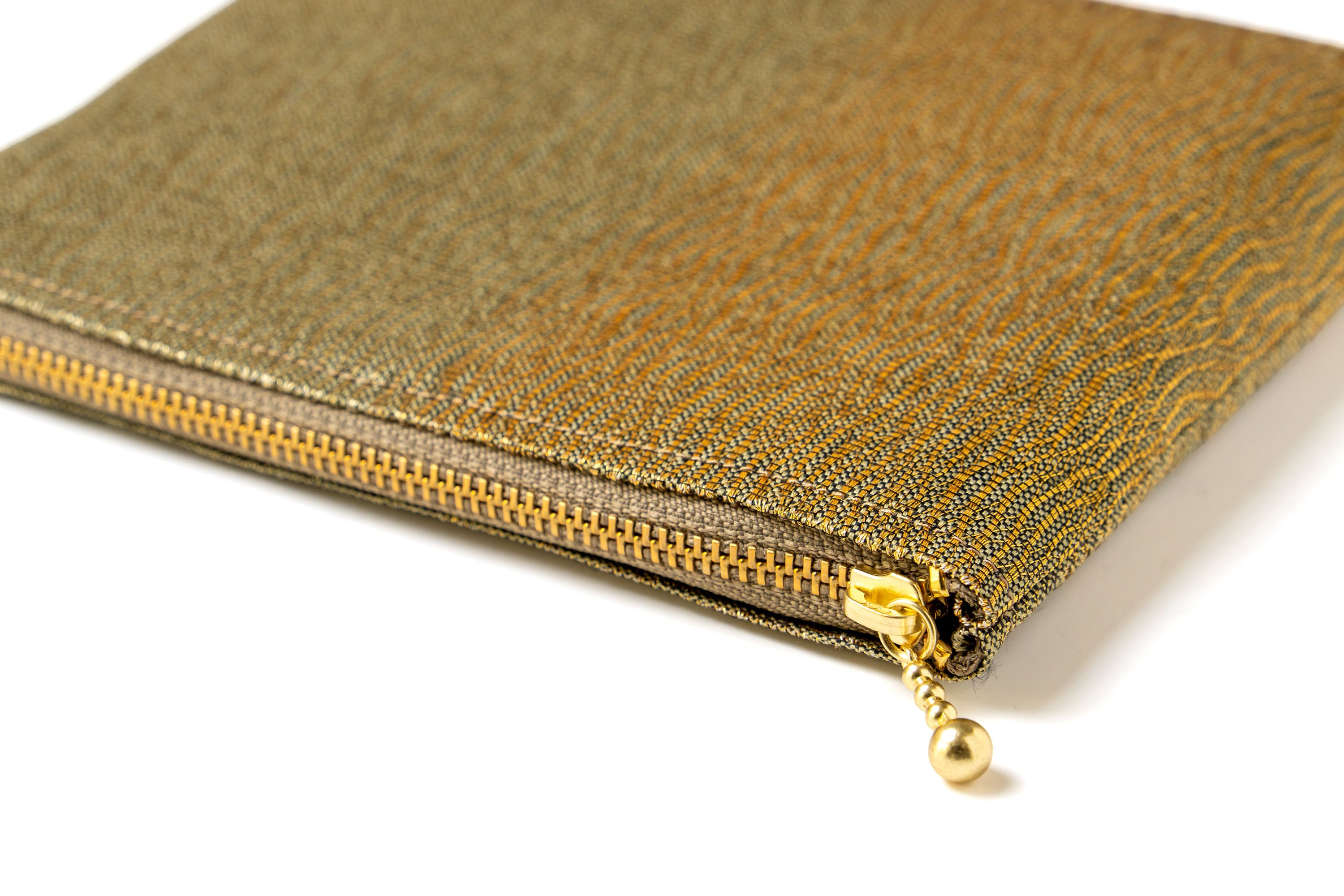 ⚫️澤屋の「らてん金錦」袋帯を使用した美しいポーチです。経絣糸に金糸を捻り合わせ、青貝箔で織り上げた『霞』紋様の帯地で仕上げられております。