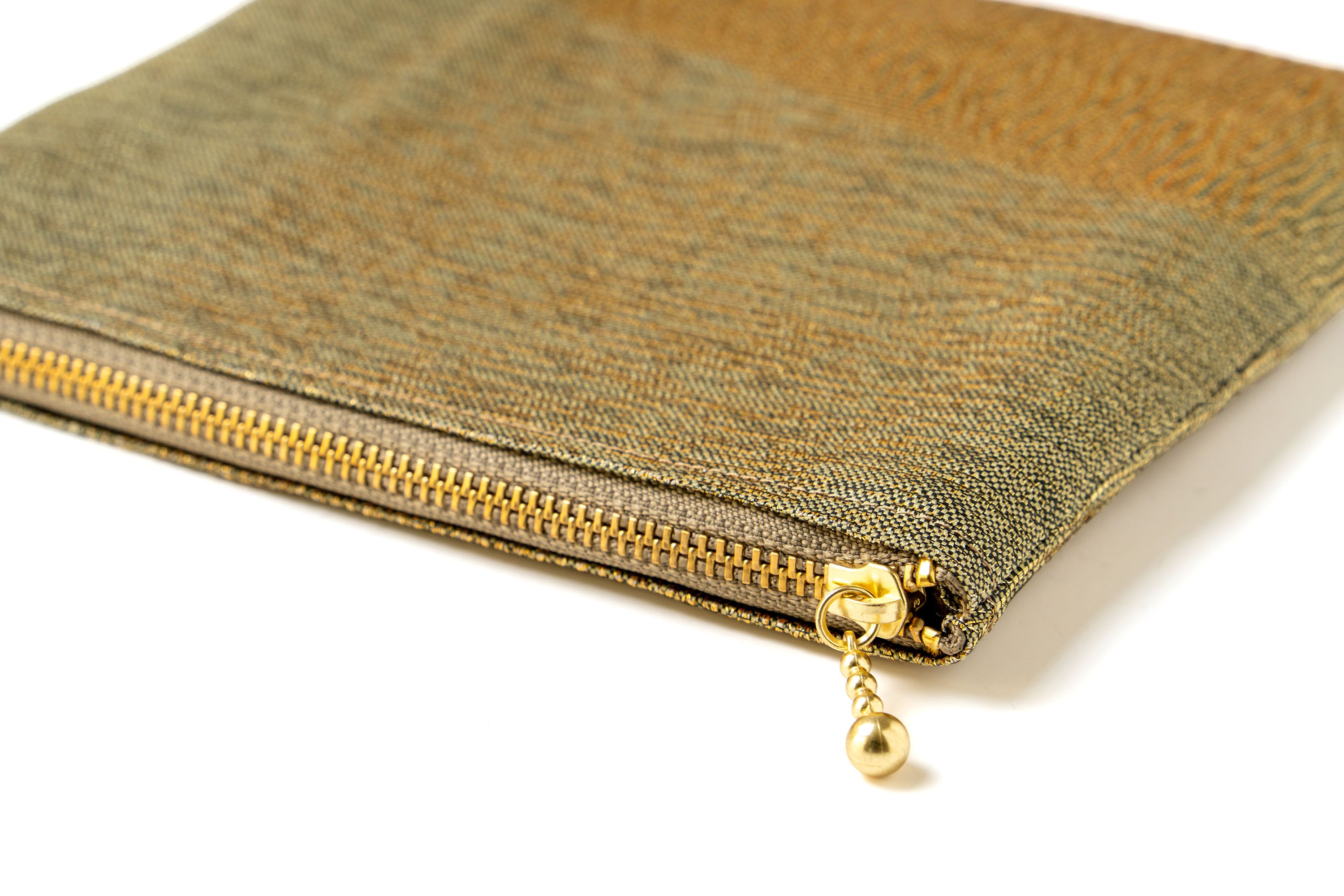 ⚫️澤屋の「らてん金錦」袋帯を使用した美しいポーチです。経絣糸に金糸を捻り合わせ、青貝箔で織り上げた『霞』紋様の帯地で仕上げられております。