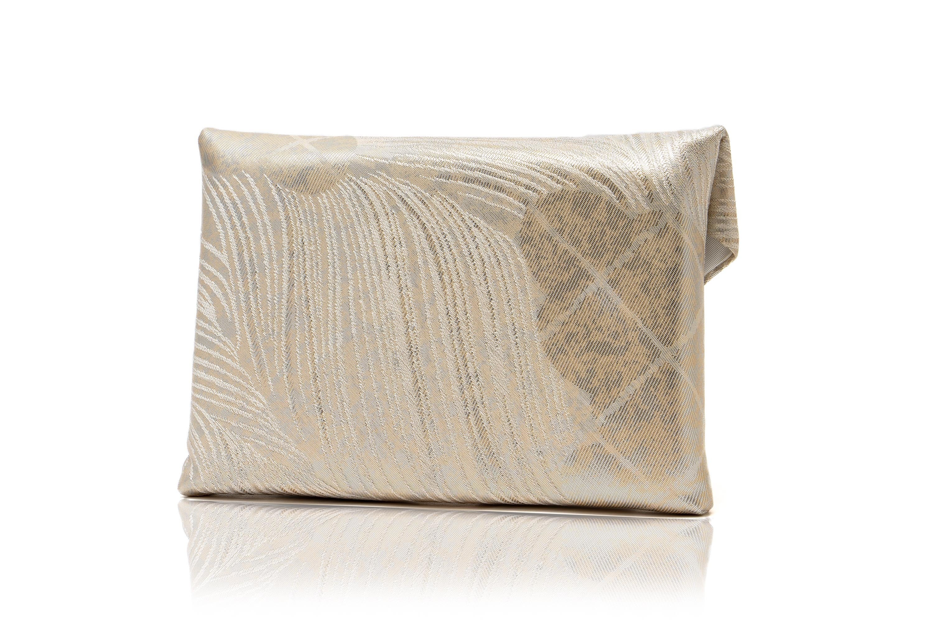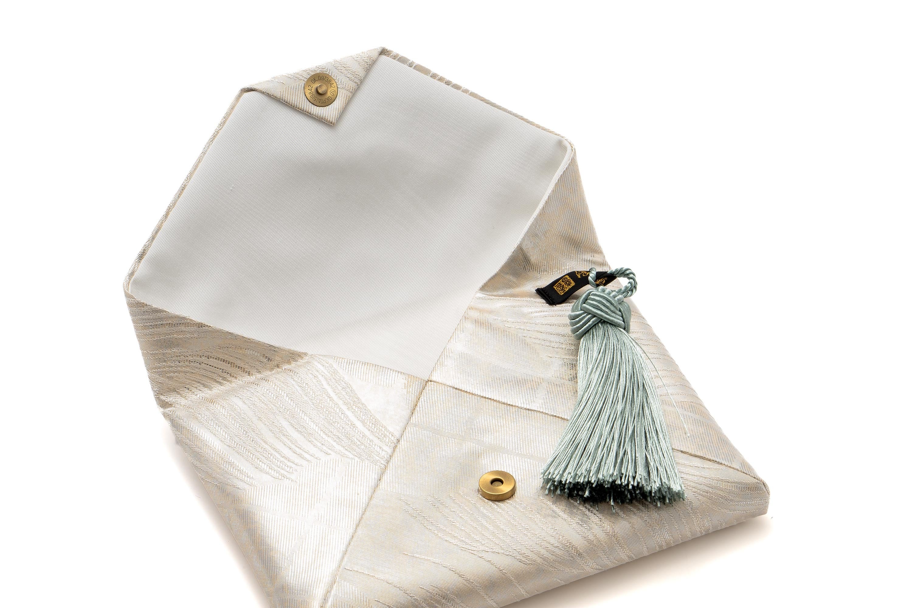 お茶席に必要な「袱紗・扇子・懐紙・菓子切」などをまとめて入れる、おなじみのすきや袋に、モロッコの職人による手作りタッセルを付けました。重兵衛は2014年テーマ『絹感』より、モロッコ王国御用達の職人達との親交を深めてまいりました。今もモロッコの様々な職人たちとコラボレーションで作品を製作し続けています。2019年のパリの展示会では、パリジェンヌに一番人気の作品でした。やわらかなようでしっとりとした質感は、Bag in Bag として、またクラッチバックとしてもお使いいただけます。